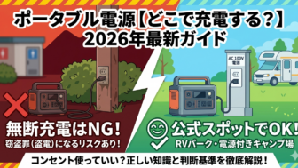 数十円の充電でも警察に通報!?ポータブル電源の無断充電は「盗電」です。知らなかったでは済まされないトラブルを防ぐため、合法的に充電できる場所(RVパーク・最新の道の駅・ネットカフェ等)とマナーを完全ガイド。EVスタンドでの急速充電術や自給自足のコツも紹介。電源の不安をゼロにして、自由な車中泊・キャンプを楽しみましょう。