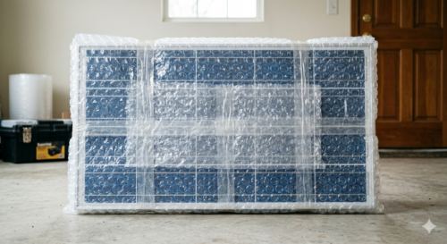 - 受光面(ガラス面)の保護: パネル表面には、プチプチ(緩衝材)を多めに巻いた上で、厚手の段ボールを二重に当てるなどして、絶対に衝撃が伝わらないようにしてください。