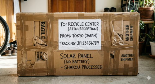 - 遮光(しゃこう)処理の徹底: 梱包自体が遮光になりますが、念のため、パネルを畳むか、表面にテープを貼るなどして、箱の中で発電しないようにしてください。