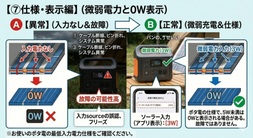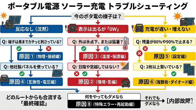 今の状態を「①ポタ電が反応すらしていない」「②表示は出るが0W」「③充電はされるが遅すぎる」の3つの入り口に当てはめてみてください。これだけで原因はぐっと絞り込まれます。