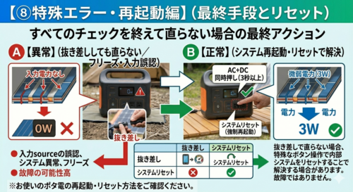 すべてのチェックを試しても解決しない場合、ポータブル電源という「精密なコンピューター」が一時的な勘違い(脳内フリーズ)を起こしている可能性があります。