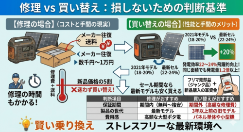 100Wクラスのパネルなら、修理を依頼する手間と費用を考えれば、Amazon等のセールで最新モデルが買えてしまうケースがほとんどなのです。