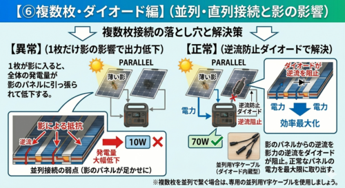 並列接続中、片方のパネルが影に入ると、発電しているパネルから影のパネルへ電気が吸い込まれてしまう「逆流現象」が起きます。これを防ぐのが「逆流防止ダイオード」です。