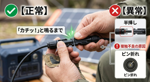 ポータブル電源の液晶が「0W」のまま反応しない場合、まずは「カチッ」という接続音だけで安心せず、目視と感触で完璧に通じているかを確認してください。