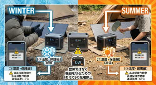 そのため、主要メーカー(Anker, EcoFlow, Jackery等)には「低温保護機能」が備わっており、本体が冷え切っていると充電を自動遮断します。