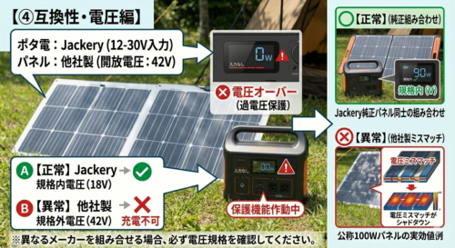 他社製のパネルを組み合わせる場合に必ず確認すべきは、目に見えない「電圧(V:ボルト)」の壁です。