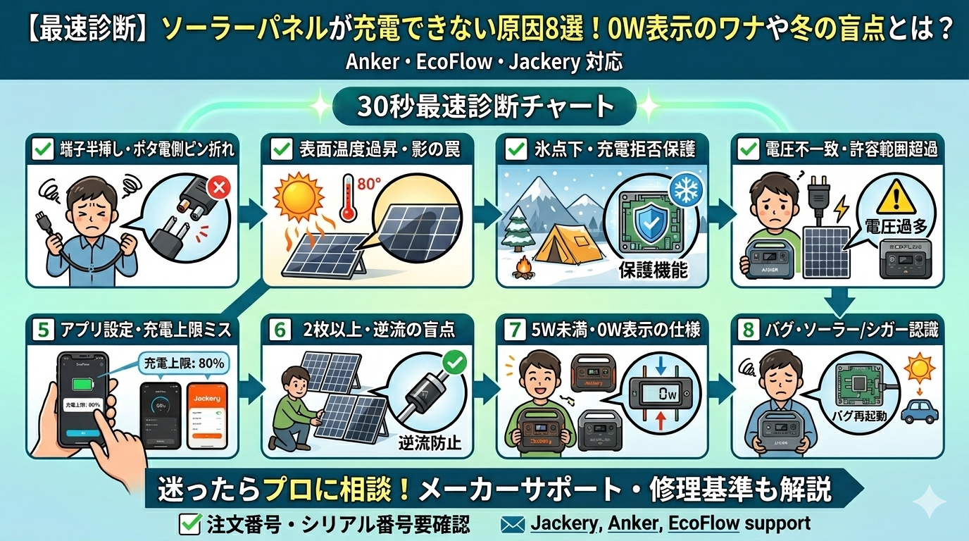 【30秒診断】ソーラーパネルが充電できない原因8選!0W表示のワナや冬の盲点とは?Anker・EcoFlow・Jackery対応